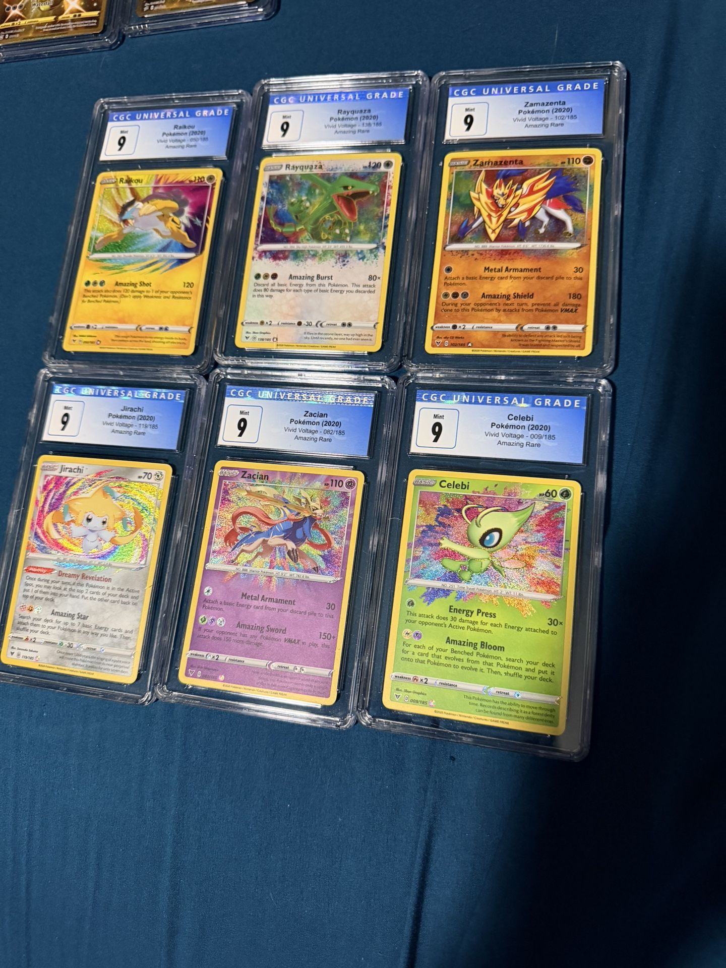 Has whole set of 6 amazing rares CGC 9 slabs Rayquaza, zamazenta, zacian, celebi, jirachi, raikou. $200 cash only pickup only