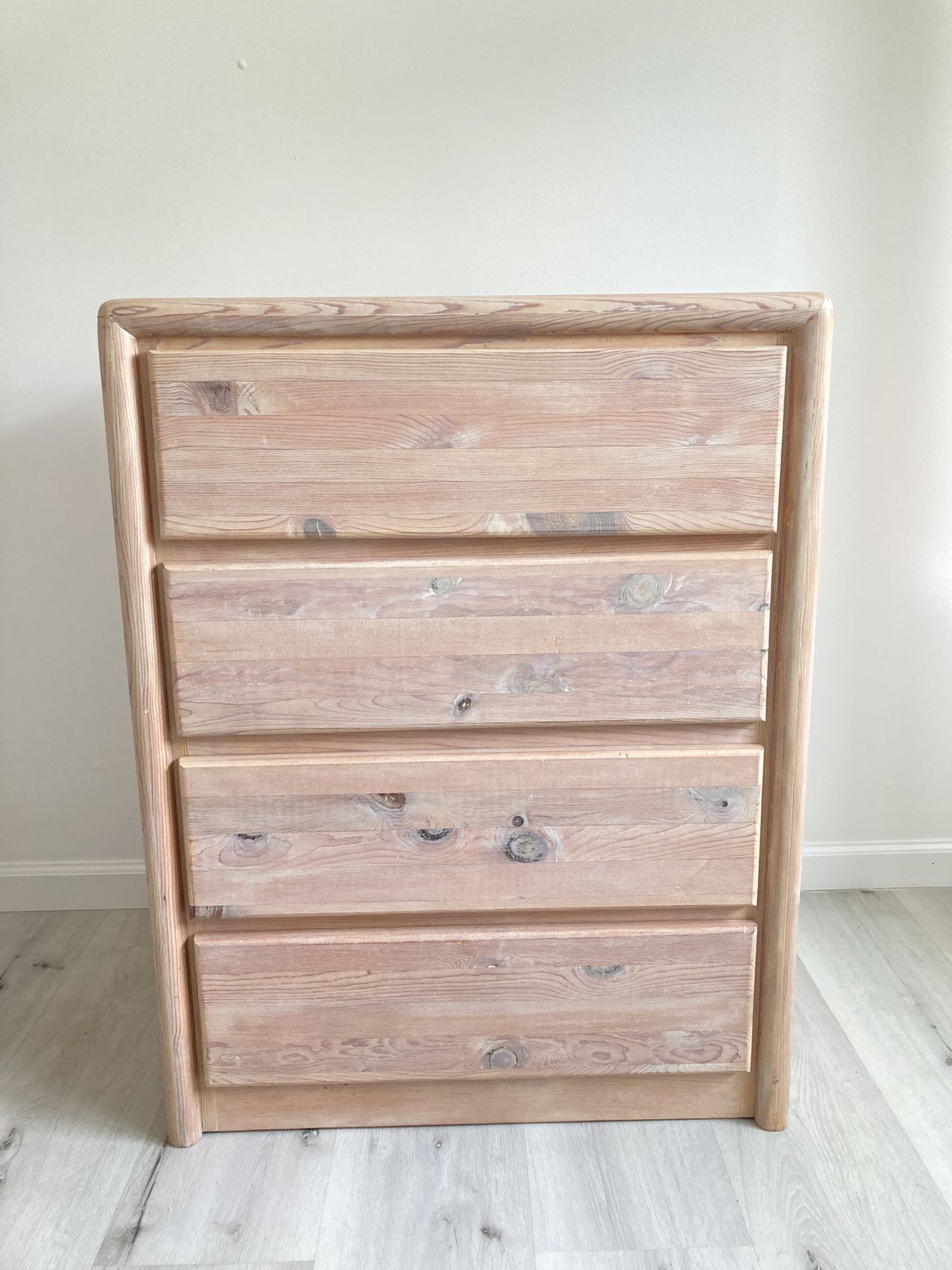 round edge whitewash wood dresser with 4 drawer storage. The drawers work perfectly. 38 in H 30 in W 18 in D