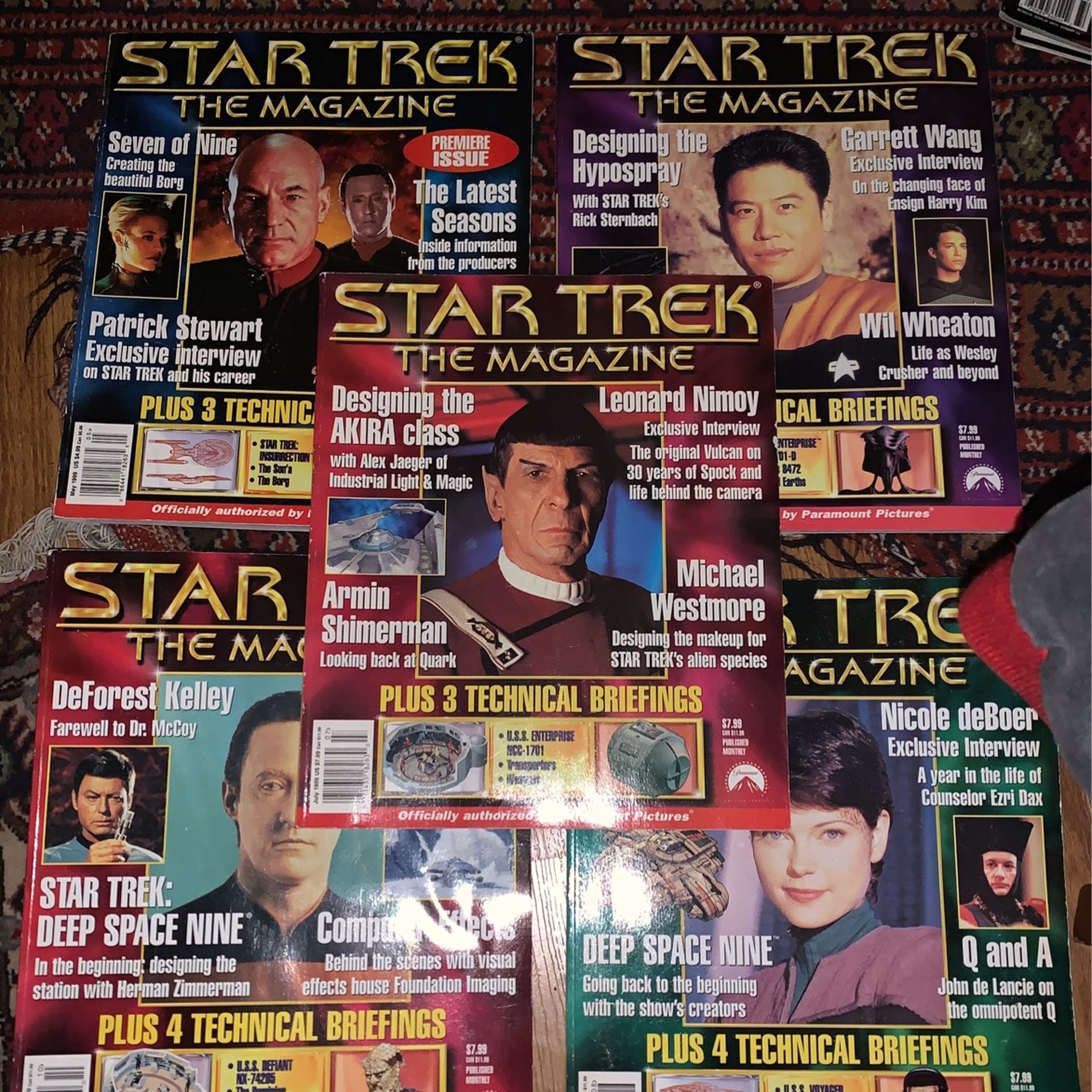 7 issues of Star Trek voyager the mag. Incuding that issue #1!(collectors edition) 5 issues of Star Trek ds9 the ag. 6 issues of Star Trek next gen. The mag. 5 issues of Star Trek communicator the mag. 5 Star Trek “the magazine” large paperback books 2 issues Star Trek feat. Mags