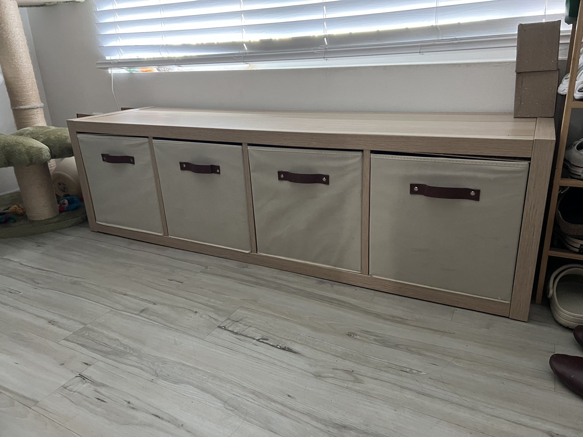 kallax shelf unit super cute just selling cuz moving she does need some adhesive, and some skinnier hosts… sitting not adult friendly but tiny ones should be fine lol $50 on ikea