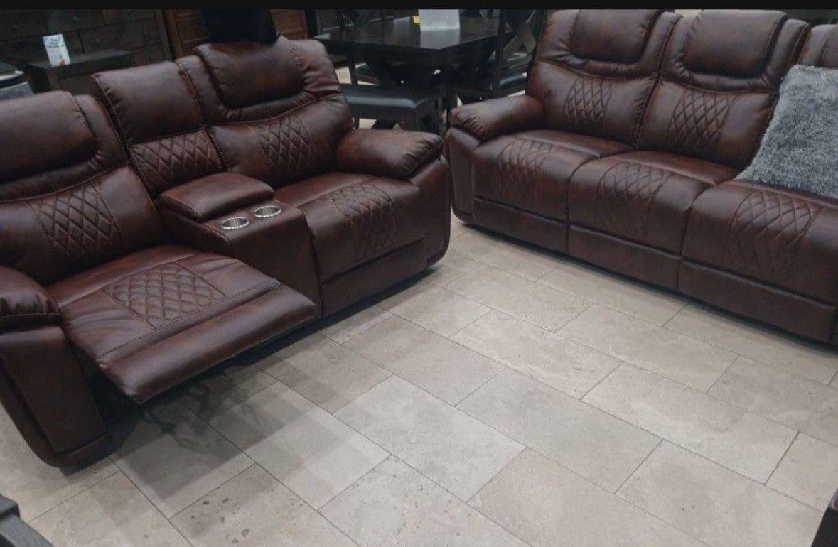 Winter clearance. Santiago brown leather reclining sofa and loveseat set only $1199. Easy finance option. Same day delivery.