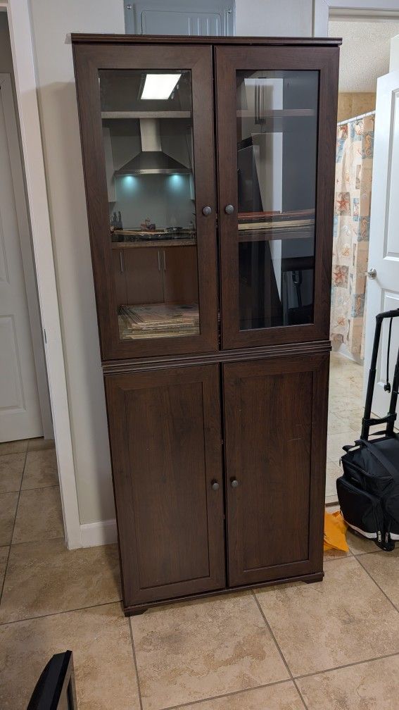 This versatile and elegant dark brown storage cabinet is perfect for adding both style and organization to any room! Features: Upper Display Section: Two framed glass doors open to reveal display shelving, ideal for showcasing china, collectibles, books, or framed art. Note: Contents shown in the photo are not included. Lower Storage Section: Two solid wood-look doors provide ample, concealed storage space to keep items neatly tucked away. Material: Durable wood composite construction with a rich, dark brown finish (veneer). Condition: Used-Light Wear Usage: Great for dining rooms, living rooms, home offices, or hallways. Location: Brickell