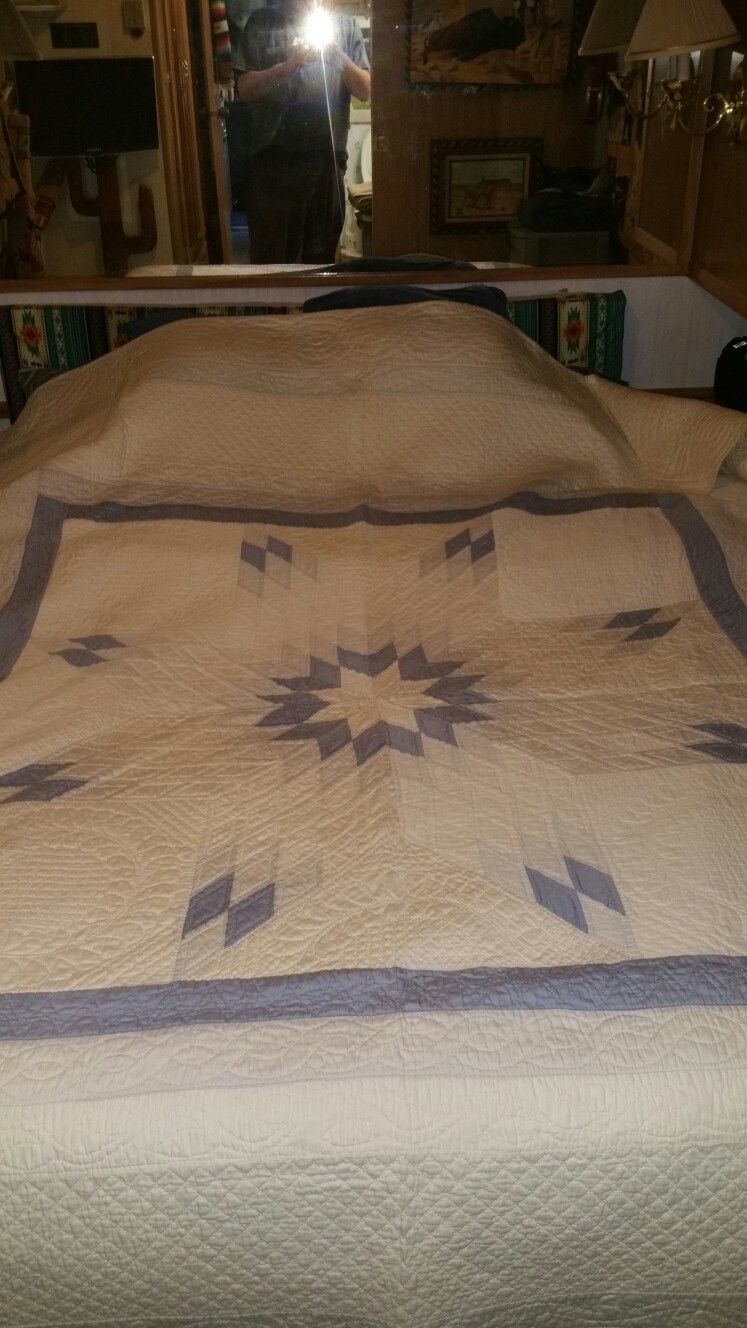 Beautiful handmade star of Texas quilt. Amazing fine stitching and nice light blue, off white and design. I purchased this from estate sale in Texas many years ago. I have never used and only placed on bed to take pictures. In mint condition. No issues,damages or smells. It's approximately 90" x 70" so easily fits a queen or can be used on king bed. This is so beautiful it can hung against a wall for display. The cotton is considered medium to heavy thickness and so fine of cotton that it feels like silk. It's really beautiful. Don't miss out. Reasonable offers will be considered.