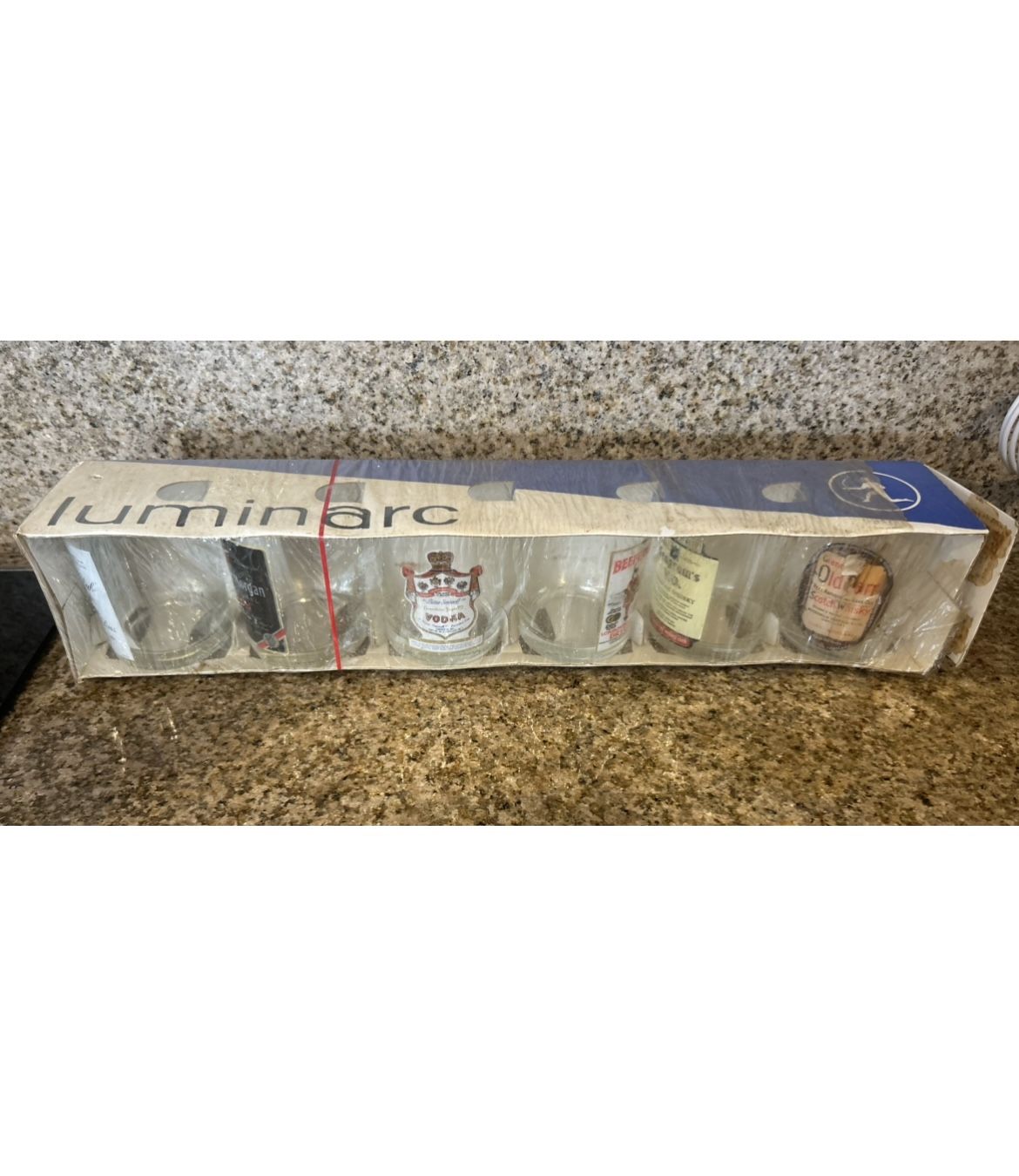 Cristal D'Arques Durand Luminarc France glassware, featuring alcohol brand names, 6 glasses total. New Vintage, in original packaging never been opened Excellent condition, free of chips or cracks Great for bar collection or alcohol connoisseur Pictures aren’t great but that is due to the plastic on packaging through aging & debris, glassware in packaging is in perfect condition. This set is SO cool! * Rare Find * cannot find anywhere online