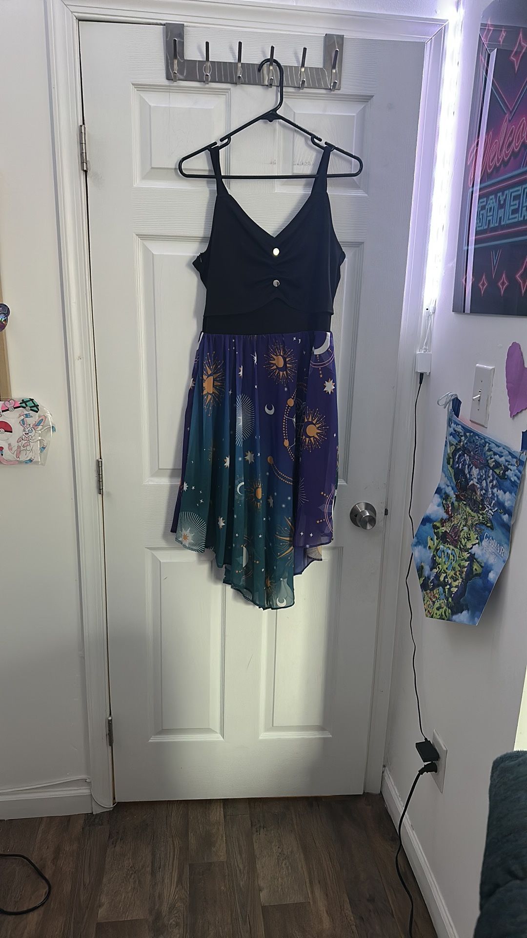 Float through the stars in this stunning celestial print dress featuring a navy V-neck spaghetti strap top and a flowy handkerchief hem skirt with a galaxy-inspired sun, moon, and star pattern in deep purples, teals, and gold tones. The bodice is styled like a faux vest with two decorative front buttons for extra flair. Whether you’re headed to a festival, witchy gathering, or a moonlit picnic, this dress brings bold alt-girl meets stargazer energy.