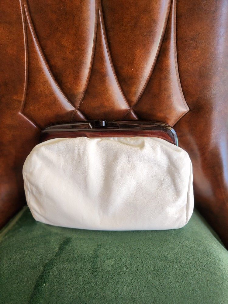 Vintage leather clutch Good Clean Condition Kiss Lock Clasp , Rootbeer Plastic, Lucite Handle smoke free home