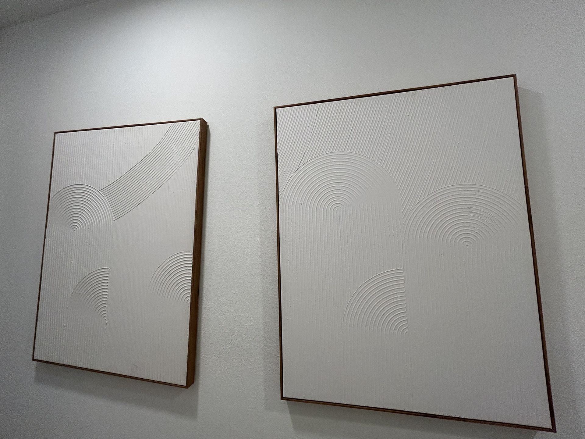 White textured plaster art on a white canvas. Framed in a brown wood frame. Bought at home goods. In perfect condition just moving. Sold as a set or willing to sell separately. Dimensions: 40x30