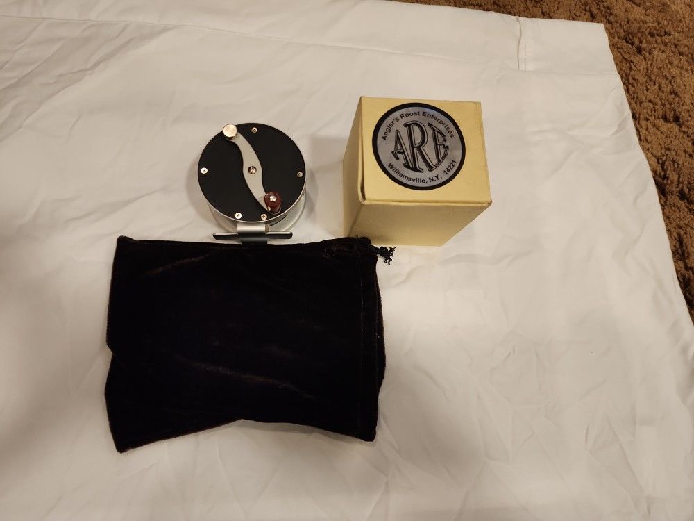 Anglers, roost, enterprises fly reel. 5 to 8 WT. The reel is new and has never been used. Comes with original box and pouch for protection. Smooth winding. Has real wood handle knob. No scratches or imperfections.