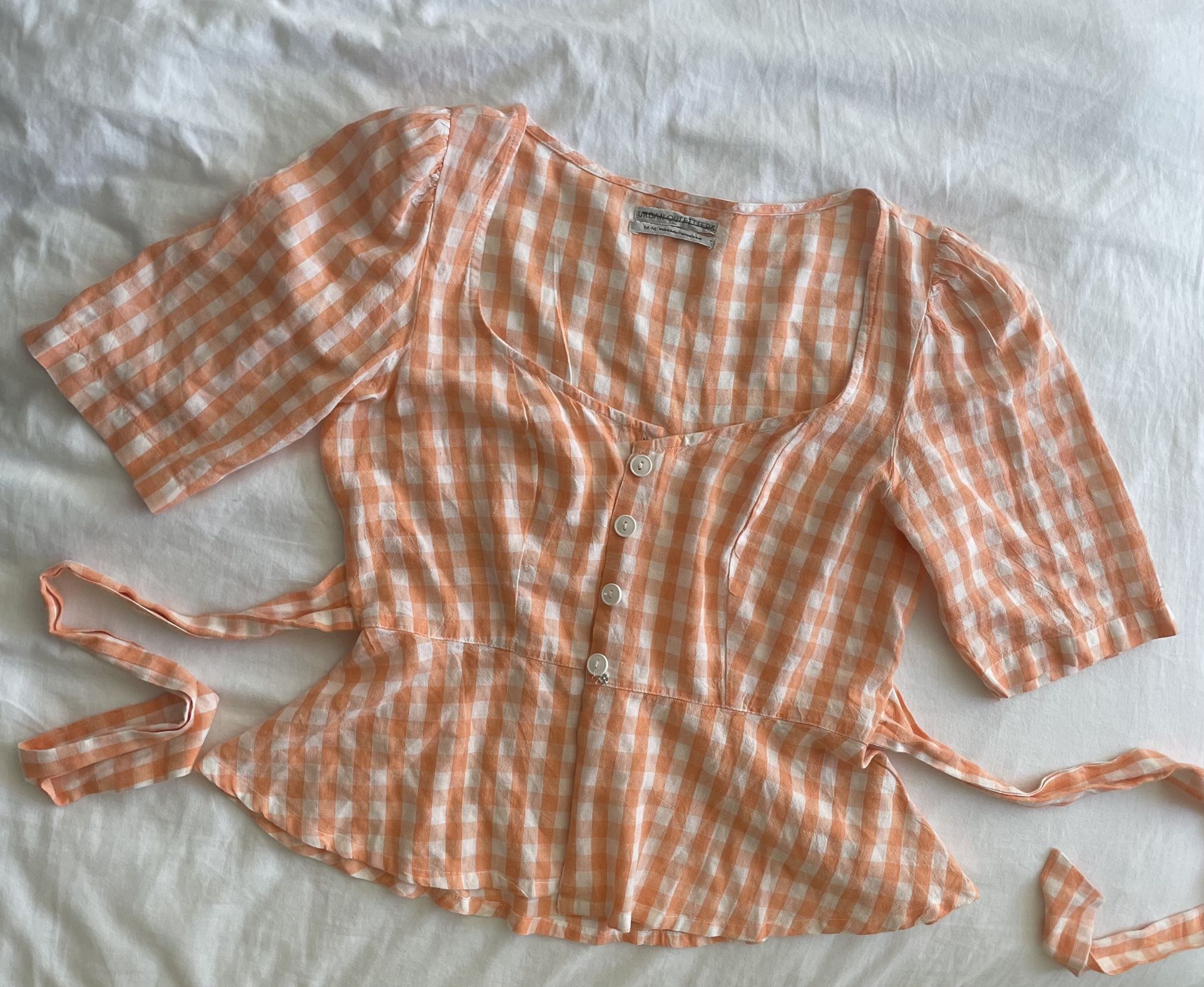 Super cute summer top! Bought new, never used. Button down, colors orange and white. Has additional strings to tie on the back (like shown in the photos!). And has puffy sleeves.