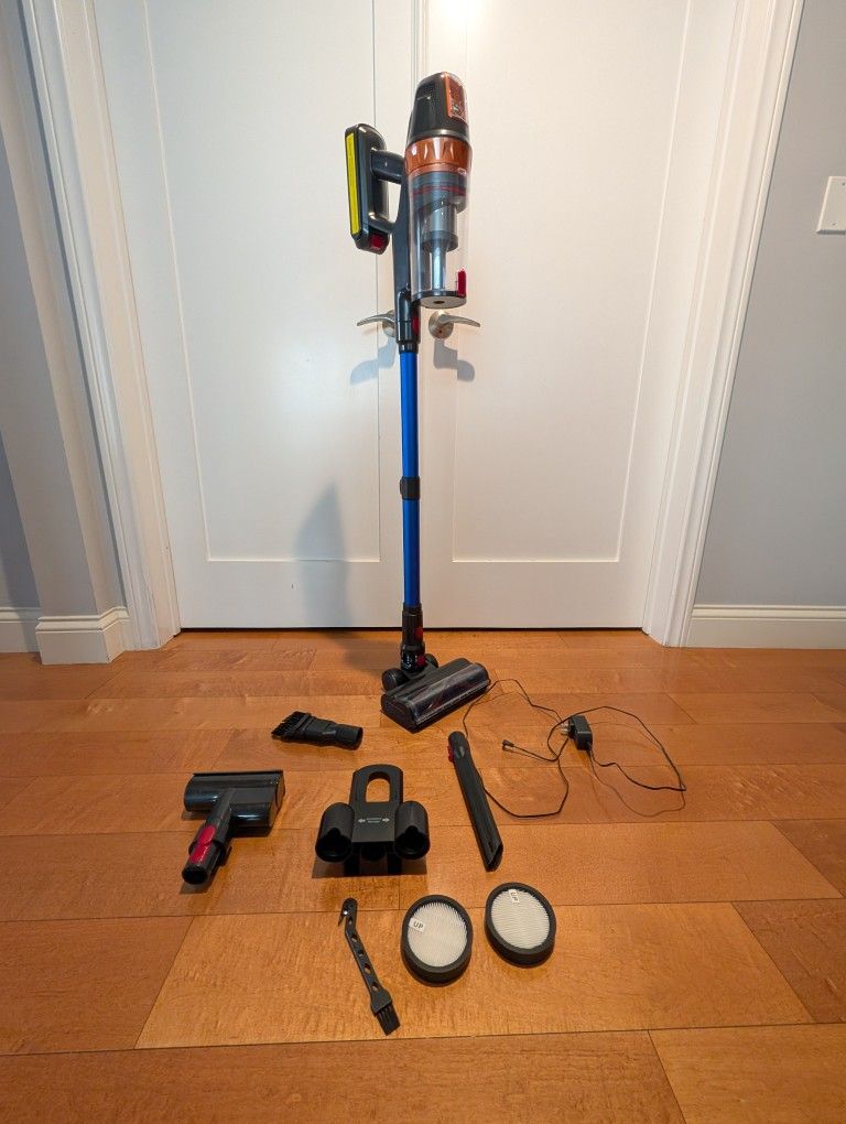 Smoture VAC03 cordless vacuum. ★[600W High-efficiency Brushless Motor] The cordless vacuum cleaner powered by a 600W brushless motor that generates 45KPA suction power, 30% stronger than most cordless vacuums, enough to deeply vacuum debris from carpets and hard floors, and easily handle your furry friends' hair, toddler snacks, and all kinds of household messes around the house! ★[With Extra Upholstery Cleaning Tool] Unlike most vacuum cleaners that only include a dusting brush and crevice nozzle, this vacuum also comes with an extra motorized brush head, which can effectively remove dust and hair from mattresses, pet beds, upholstery and stairs. You don't need to pay for separate tools for different surfaces! ★[60 Min Runtime in ECO Mode] This vacuum cleaner is equipped with an 8-cell lithium-ion battery, which can run for 60 minutes in ECO mode, (15-20 minutes in BOOST mode) enough to meet the cleaning needs of a 2,500 square foot home. The battery fully recharges in 4 hours. You can place the vacuum into the wall-mounted charging dock to charge, or you can charge the battery separately (without the wall mount). ★[Self-standing Feature] The stick vacuum stands upright on its own, allowing you to pause cleaning anytime without leaning against walls. You no longer have to find a spot to prop the vacuum up or worry about it falling over! And it fits effortlessly in corners, or behind doors, freeing up your space! ★[4 Suction Modes] You can switch to ECO, STANDARD, BOOST, AUTO suction modes with the top button and monitor the real-time status through the display. In AUTO mode, the cordless vacuum detects surface types, automatically adjusts suction power on hard floor to save battery life, and increases suction power on carpets for deep cleaning! ❤ Warm Tips: ● 60 minutes refers to the running time in power saving mode. Standard-30mins, Boost-20mins, AUTO-20`60mins.
