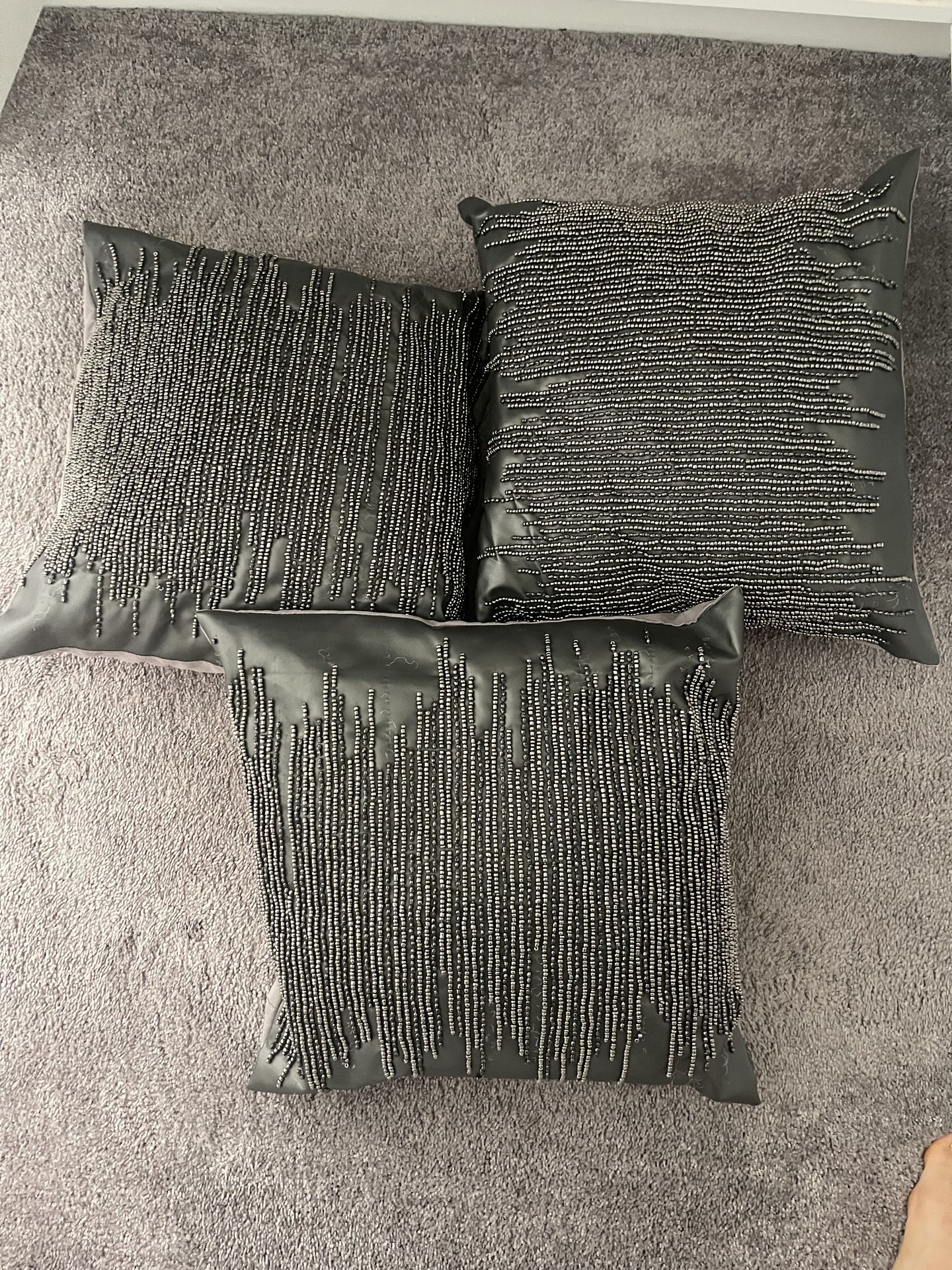 three gray embellished pillows