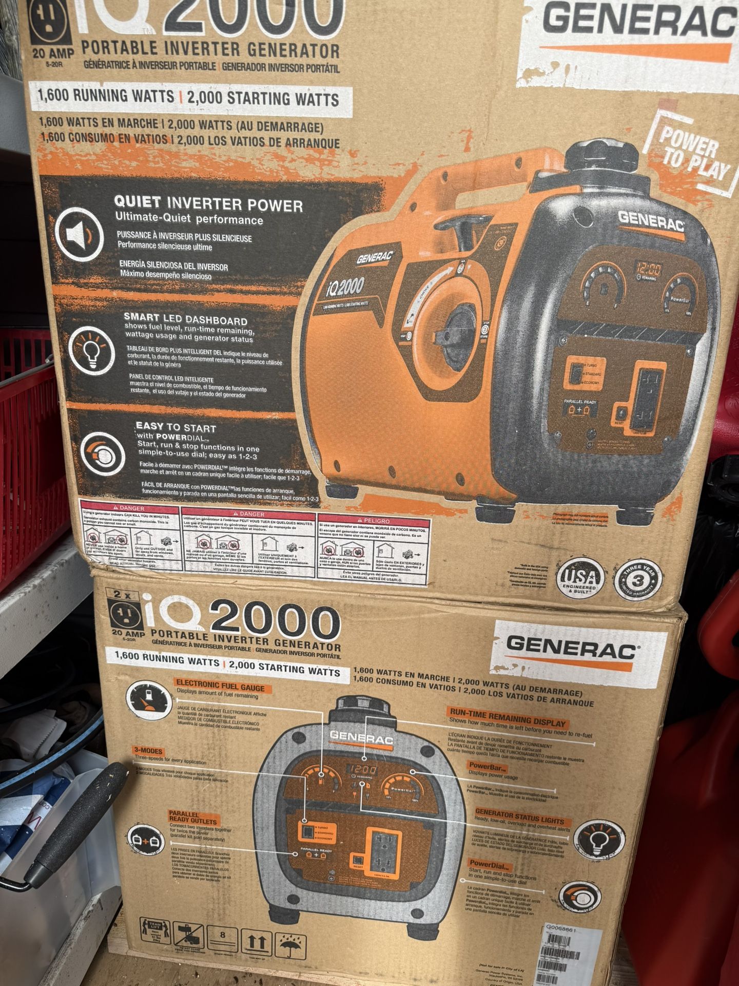 2 IQ-2000 inverter generator with generator cord, reel kit, and parallel kit inverter. Will sell items all together.