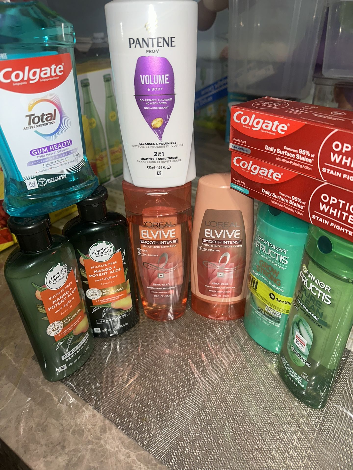 2 Herbal Essence Shampoo & Conditioner 2 L’Oreal Shampoo and Conditioner 2 Colgate Toothpaste Optic White 1 Colgate Mouthwash 1 Pantene 2 in 1