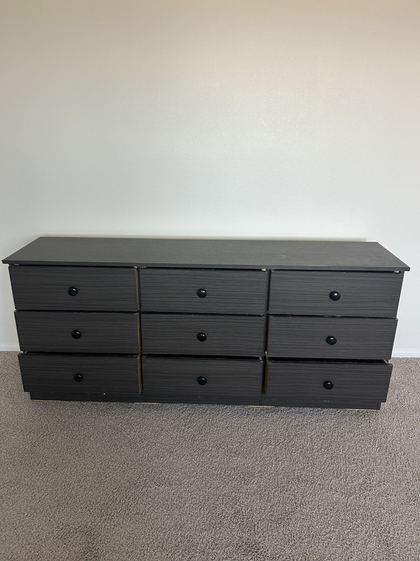Selling 9 drawer dresser AS IS in fair condition. Normal wear some wood glue is need on 2 areas which is included in photos color is dark grey with knobs. Dresser is heavy and long will need help and a truck for pick up. Located in Winchester