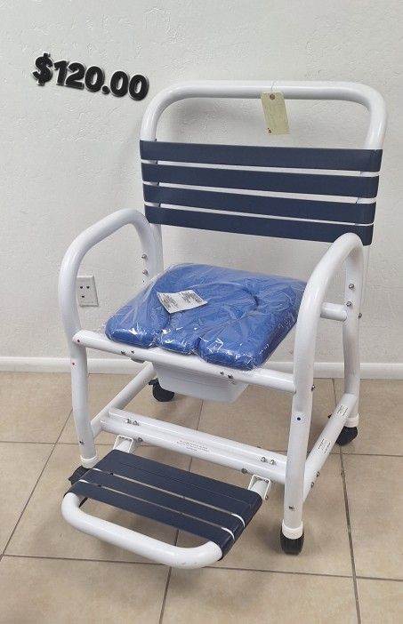 Deluxe New Era Patented Shower Commode Chair, 22" Internal Width, Open Front Removable Soft Seat, Soft Touch Folding Footrest and Commode Pail, 3" Twin All Locking Casters, 385 lbs wt Capacity.