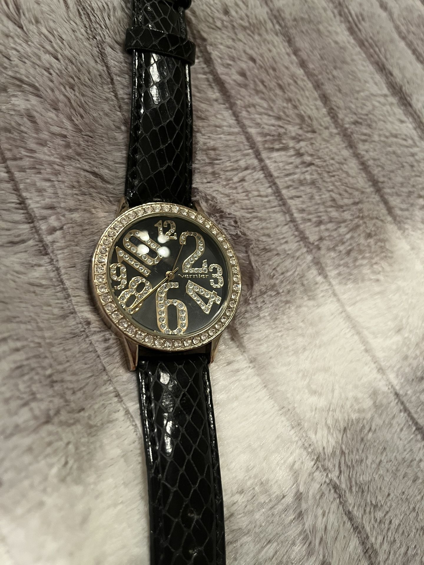 Vernier ladies watch, barely used, Japanese movement, numbers big and small. Modern, faux diamonds in each number and around. Needs batteries. Comes from a smoke free environment.