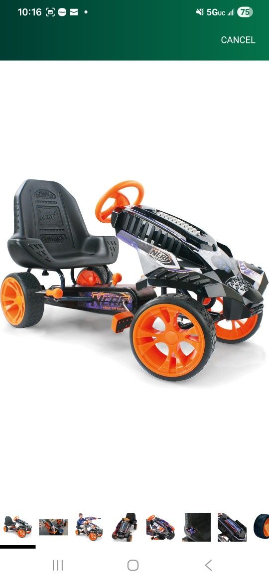 This is one of the most well-known Nerf pedal go-karts. Made with a steel tubular frame for durability. It includes placeholders for Nerf blasters, brackets, and darts, so you can mount your Nerf gear directly on the kart. Has a handbrake so you can slow down or stop. Supports kids up to about 120 lbs. Ages 4-10. Dimensions: roughly 50 in (length) × 23 in (width) × 27 in (height). Blasters and darts are not included.