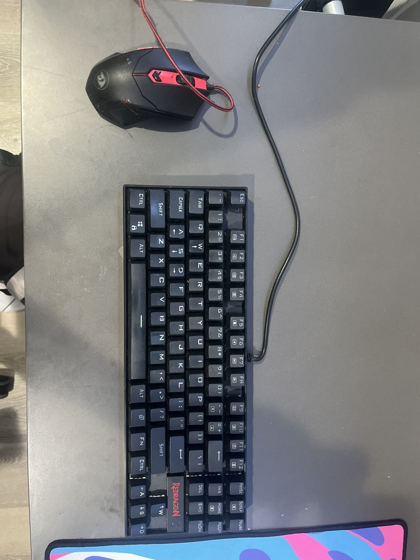 Red dragon gaming keyboard and mouse. Keyboard uses blue switches and has good input delay. Mouse has (contact info removed) dpi and works great. Both us USB cords!