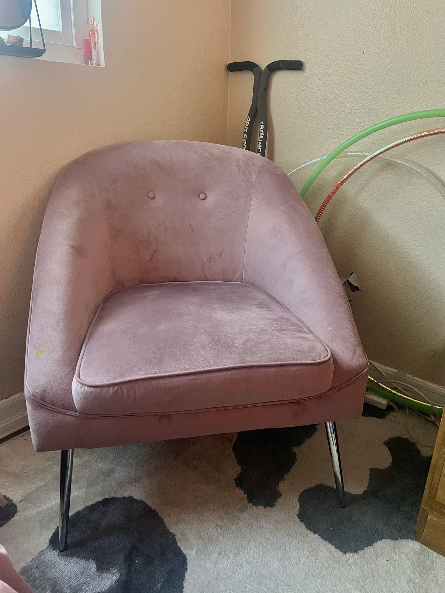 Height from floor to seat is about 17 inches and 30” total height, has a small yellow acrylic paint stain on the arm which can easily be taken out. Very cute just doesn’t fit my color scheme anymore! $50 obo