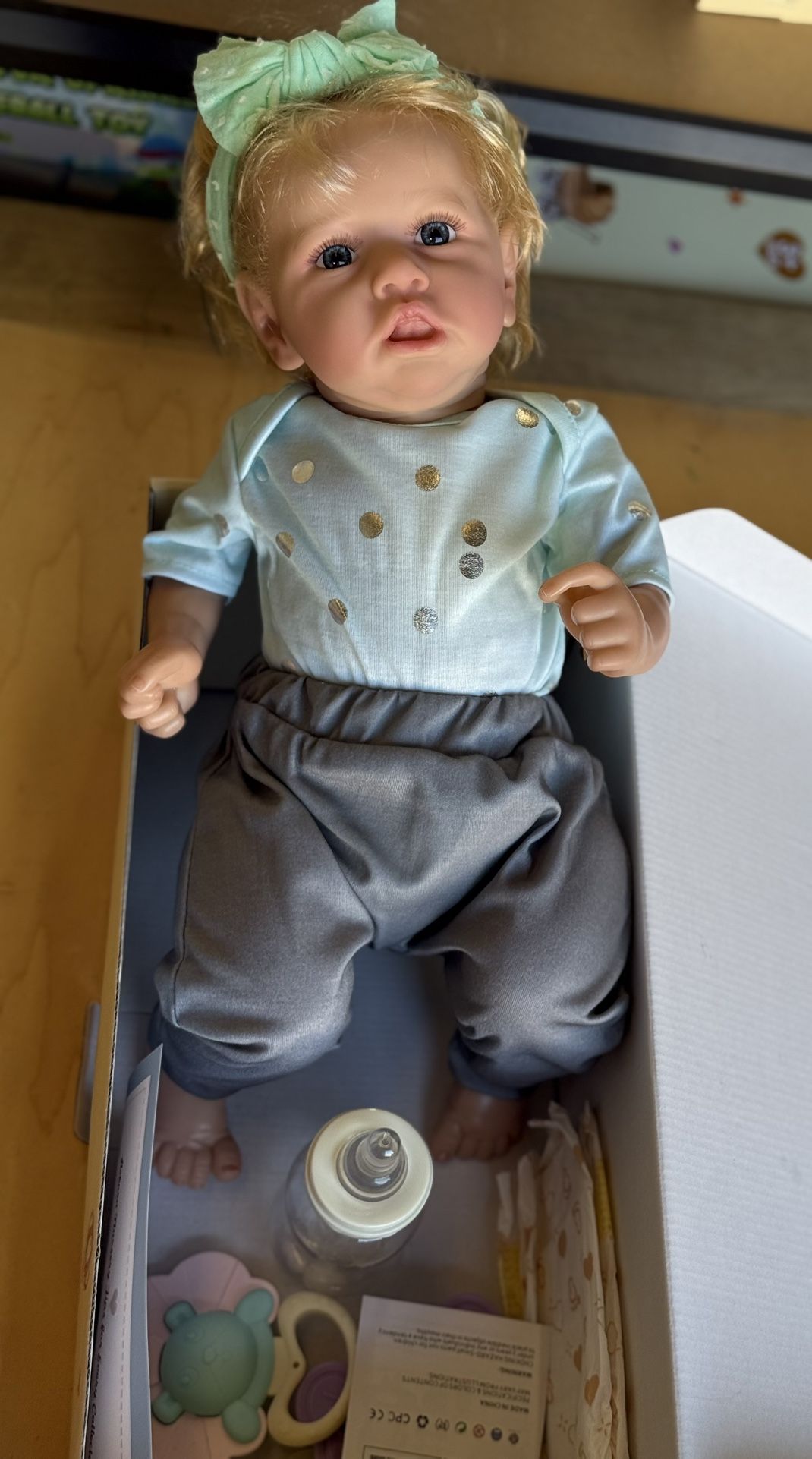 (G) Appearance: This reborn baby doll is extremely realistic with tiny capillaries and red rashes! Don't leave the baby reborn dolls in the car, it's dangerous Your Cuteness Little Baby Doll: This adorable reborn doll is very similar to a real newborn ,about 20 inch long, The life like newborn baby is true to size for kids to hold ,reborn baby doll can wear newborn sized clothes Give U Real Baby Feeling: Her head and limbs are vinyl with a soft and cuddly cloth body, when you hold her, just feels like a real baby in your arms. In addition, she also can do some cute poses, which can make playtime more joyful Detail: The realistic baby dolls is amazing for it's life like posture & limbs , twinkling eyes, hands & feet has the human skin texture. and a little vein across her nose & a wrinkle on both eyelids to add realism! Flexibility: Arms and legs has the joint part can be moved and poseable, and the head can turns from side to side.Infuse personality into playtime!