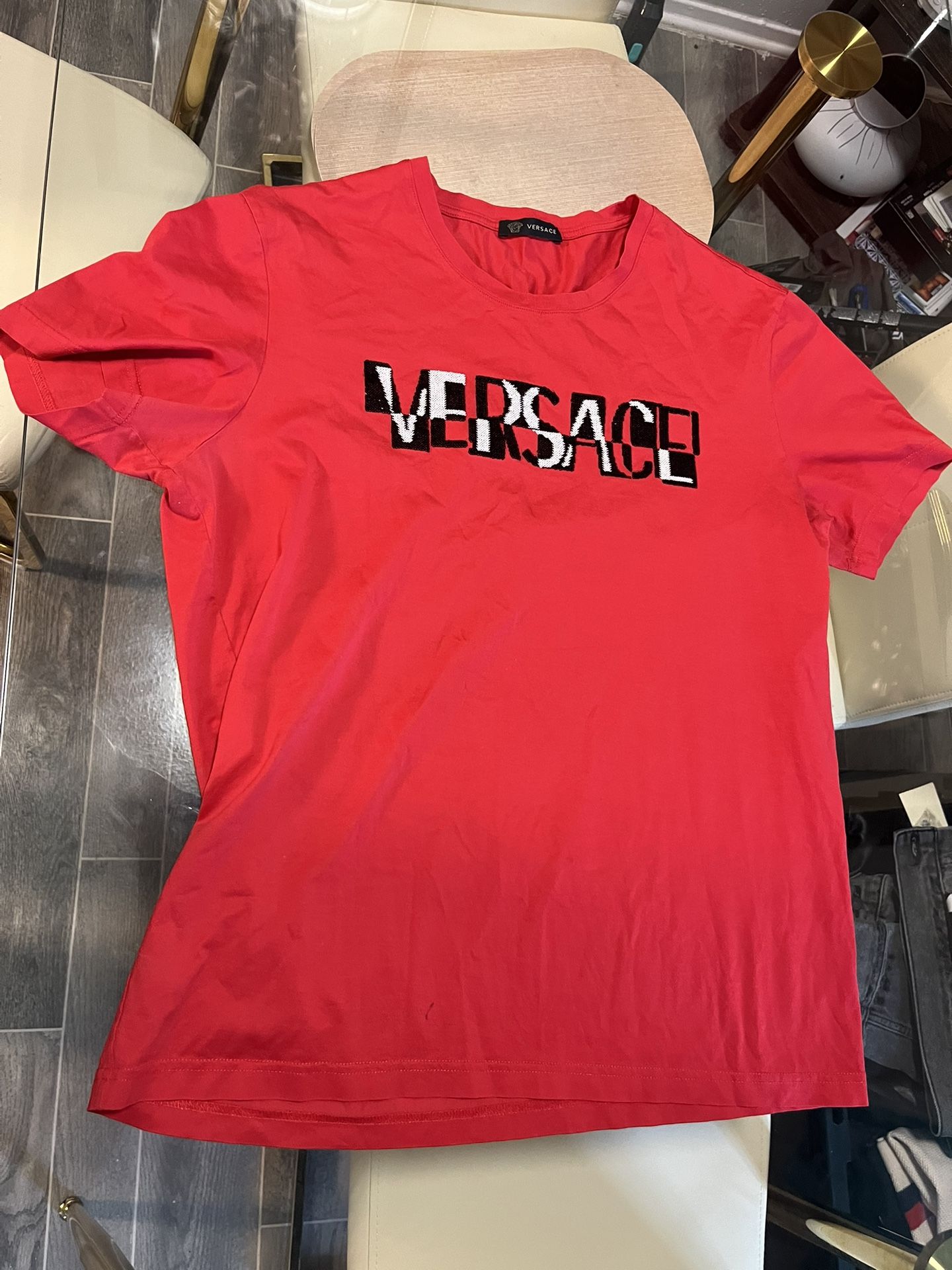 I sell red cotton t-shirt from the Versace brand with a sequin logo graphic design