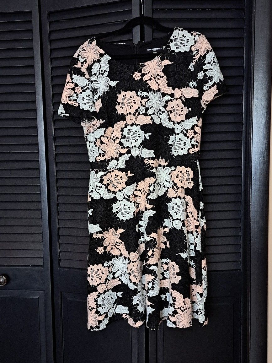 Karl Lagerfeld Black, White, Pink Floral Lace Short Sleeve Dress Women's 14