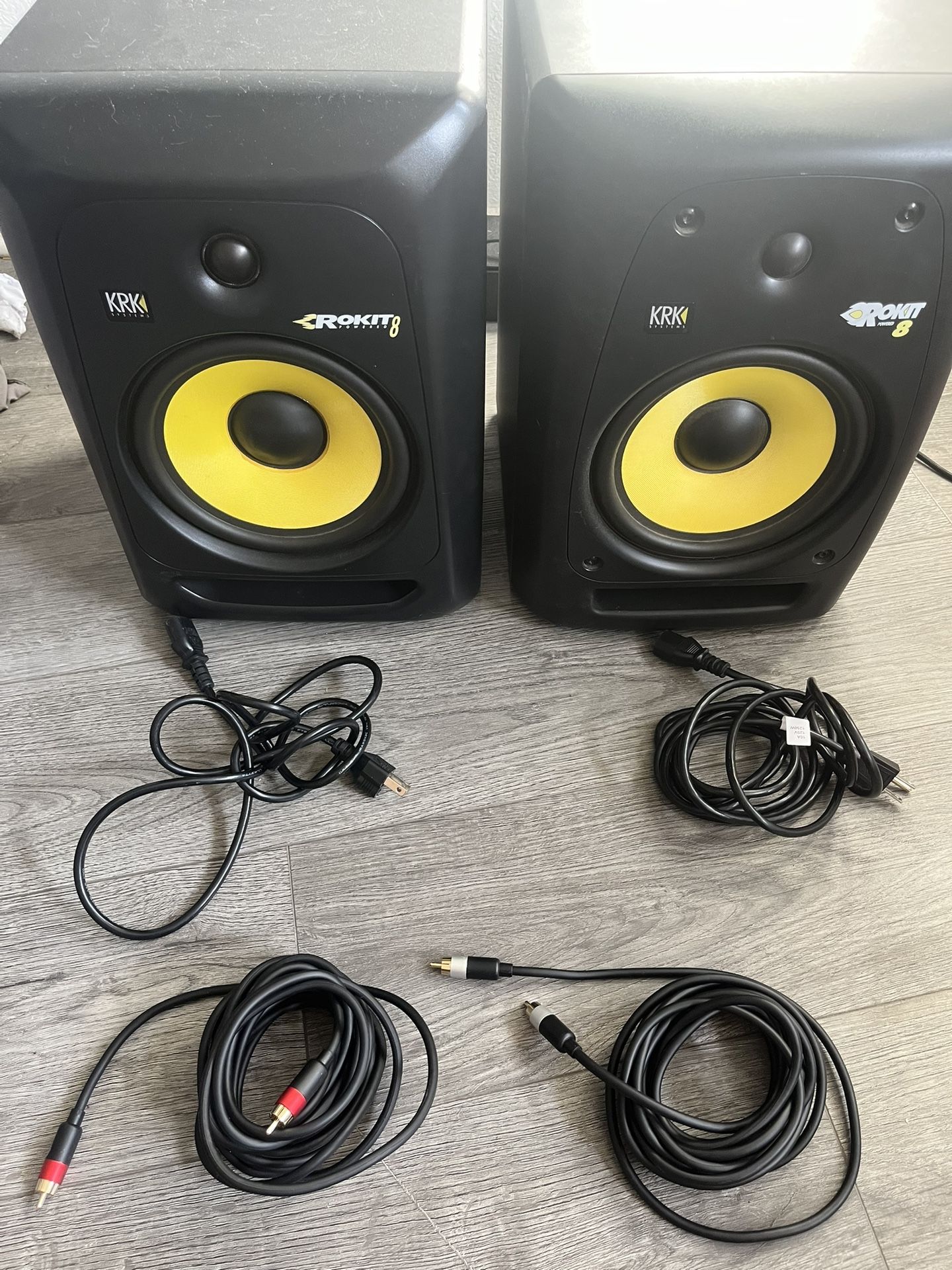RCA cables brand new (15ft) IEC cables brand new 1st(10ft) 2nd(5ft) Speakers brand used like new I can play a song to show they work and sound good