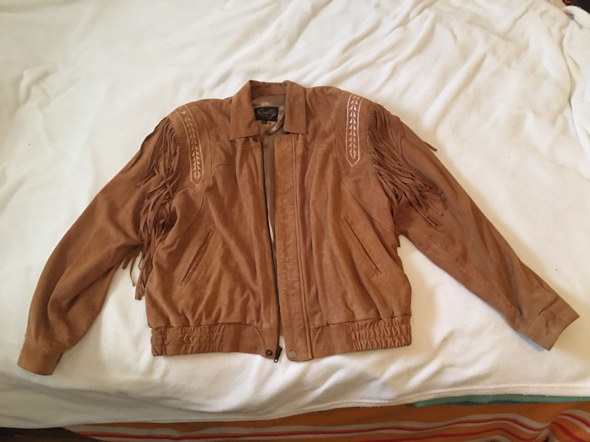 Nice leather scully jacket. Silk inside, one pocket on the inside. 2 pockets on the outside. Size XL