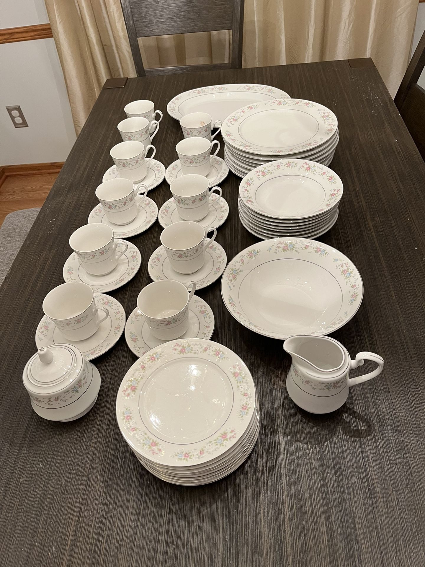 Royal Majestic china 8078 dinner set include: 8 dinner plates 8 salad plates 8 dessert plates 1 platter 1 serving bowl 8 tea cups & saucers, (+ 3 extra without saucers) 1 sugar bowl 1 creamer pot NB. No tea pot. Shipping available via ups