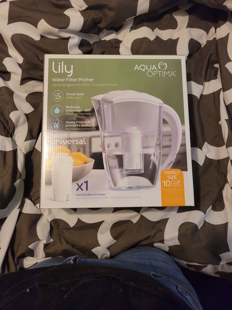 Lily aqua optima water filter pitcher. Family size 10 cup capacity. Universal filter that last 40 gallons or estimated 2 months. Brand new in boxx