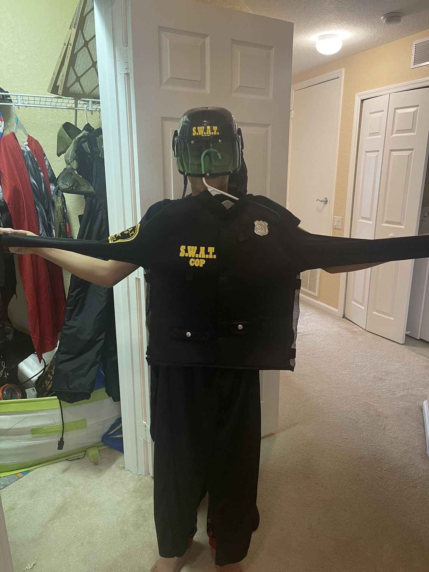 Different costumes for boys all worn once. Thor is missing mask and hammer. The swat one is complete age 10-12 but fits younger .