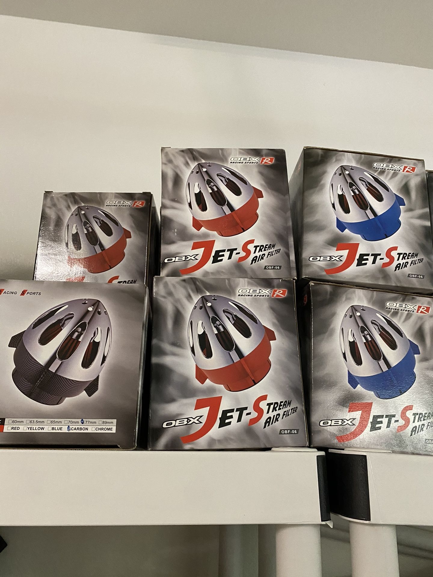 OBX Jets stream air filters. Available in carbon blue or red. These have a 3” inlet on them. Lifetime filters thay can be recharged (washed and reoiled) once dirty. Not only do they look super cool, the rocket body also offers some protection to the filter if you dont have a protective airbox, or are running your filter down around your lower bumper closer to the ground. Check out my other posts i have steering wheels, racing pedals, racing seat belt pads, fog lamp kits, bright light bulbs and more.