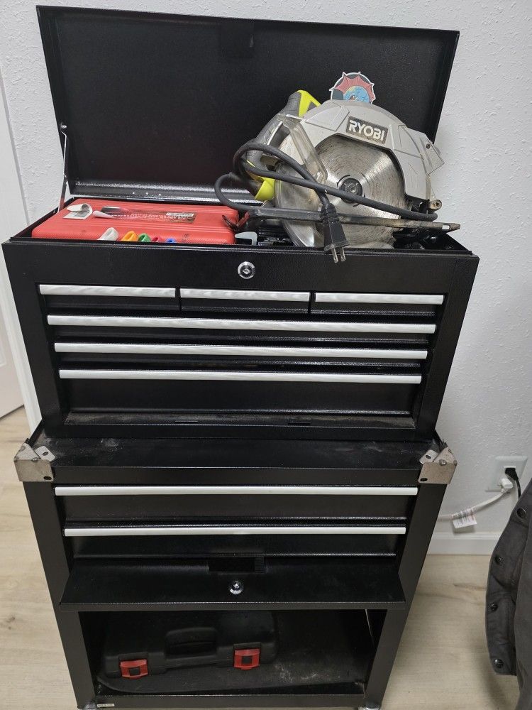 Everything you see is included. To top bot sits on the other part and can be moved or could be boosted on if you wanted to. All tools pictured are included. The bottom slide open panel is wonky but probably easily fixable.