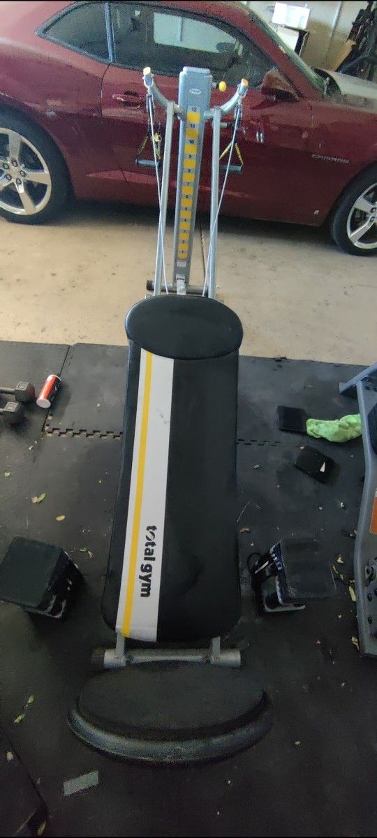 Great working top off the line total gym. Filds up to slide under bed or in closet. Has all attachments plus pilates package and ab attachments.