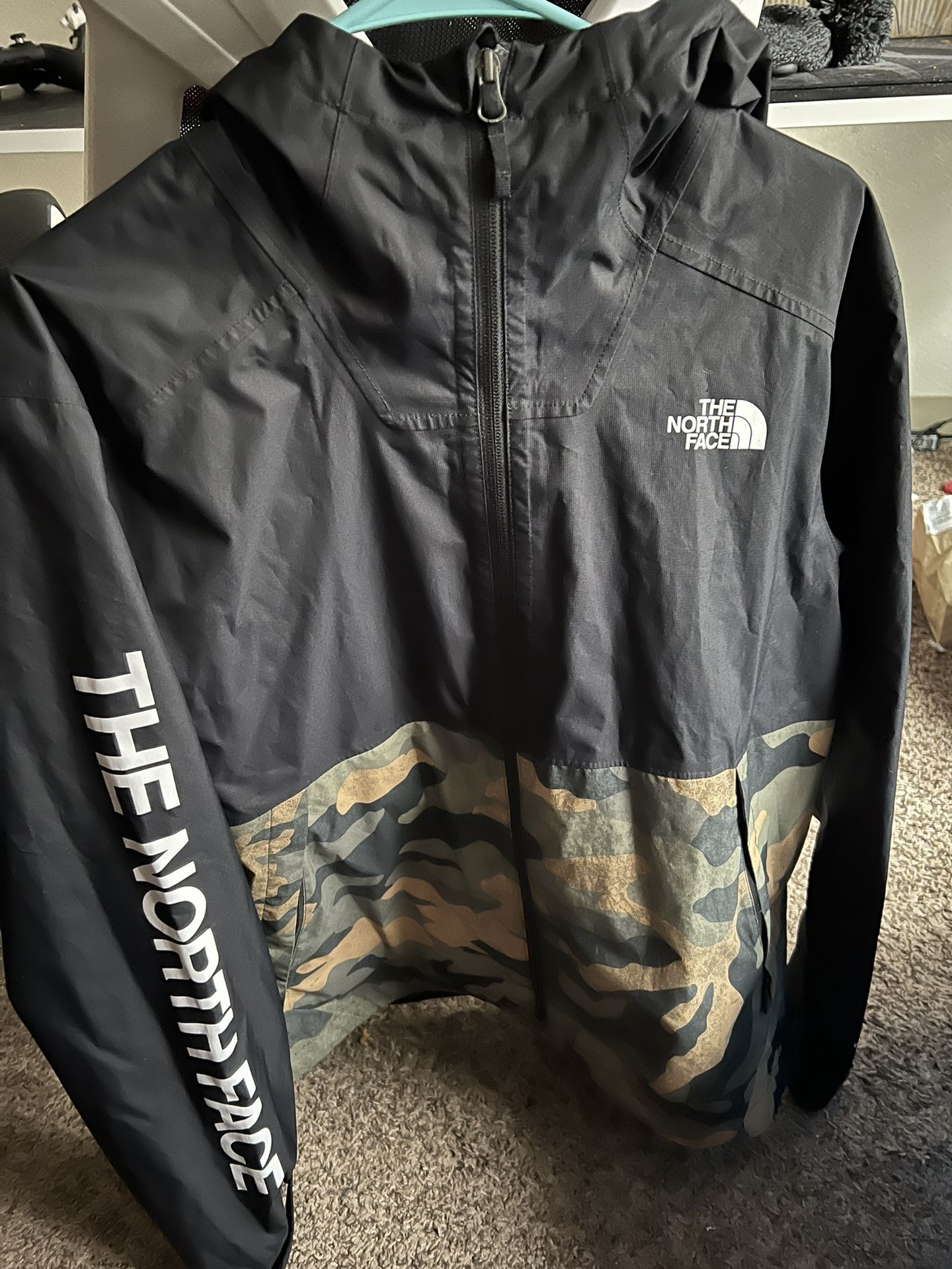 Camouflage North Face windbreaker LG(75$) Black and brown Champion windbreaker 2X(50$) Camouflage Nike sweatshirt 2X(75$) Or (150$) for all 3 All worn maybe once or twice basically brand new