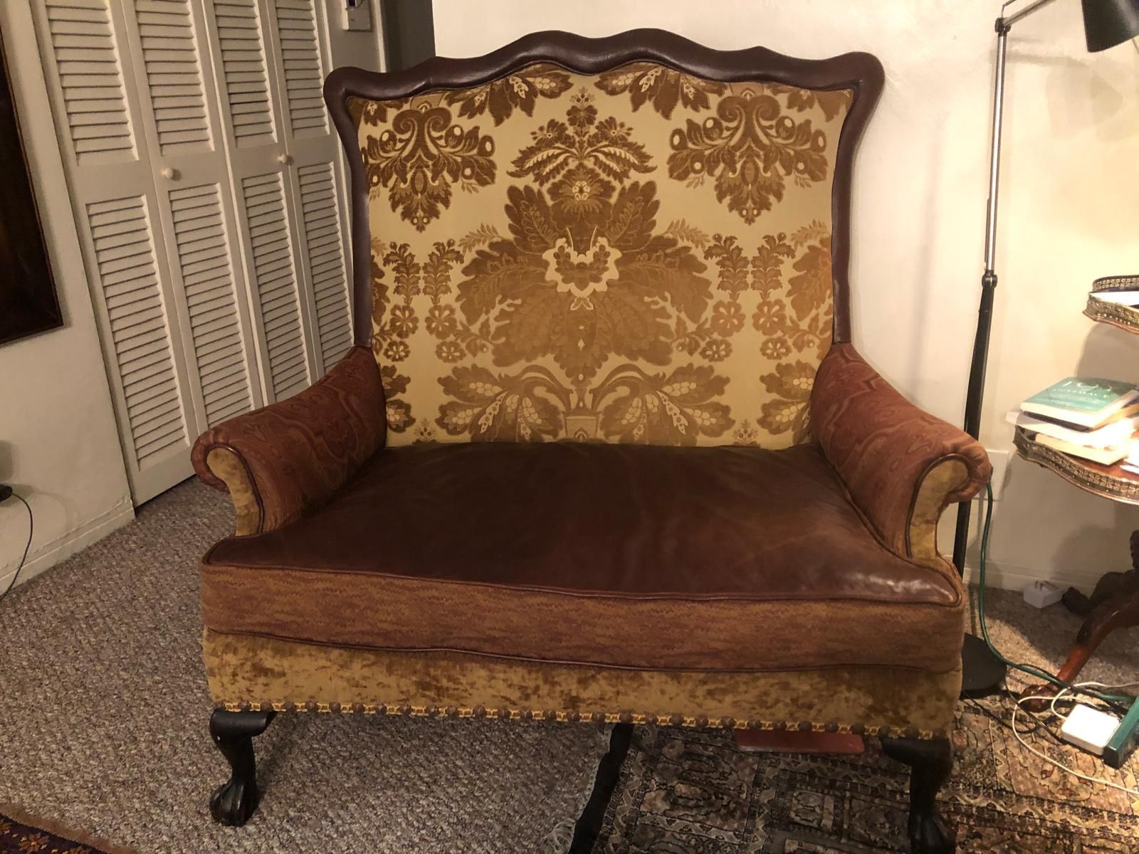 Beautiful and very comfortable loveseat designed to look like a large, luxurious armchair. A stylish statement piece that adds character and charm to any living room, bedroom, or reading corner. Mint condition and very clean. Measurements: Width: 51 in Height: 48 in Depth: 36 in High quality piece with a rich and inviting look. Perfect for anyone looking for something unique and comfortable.