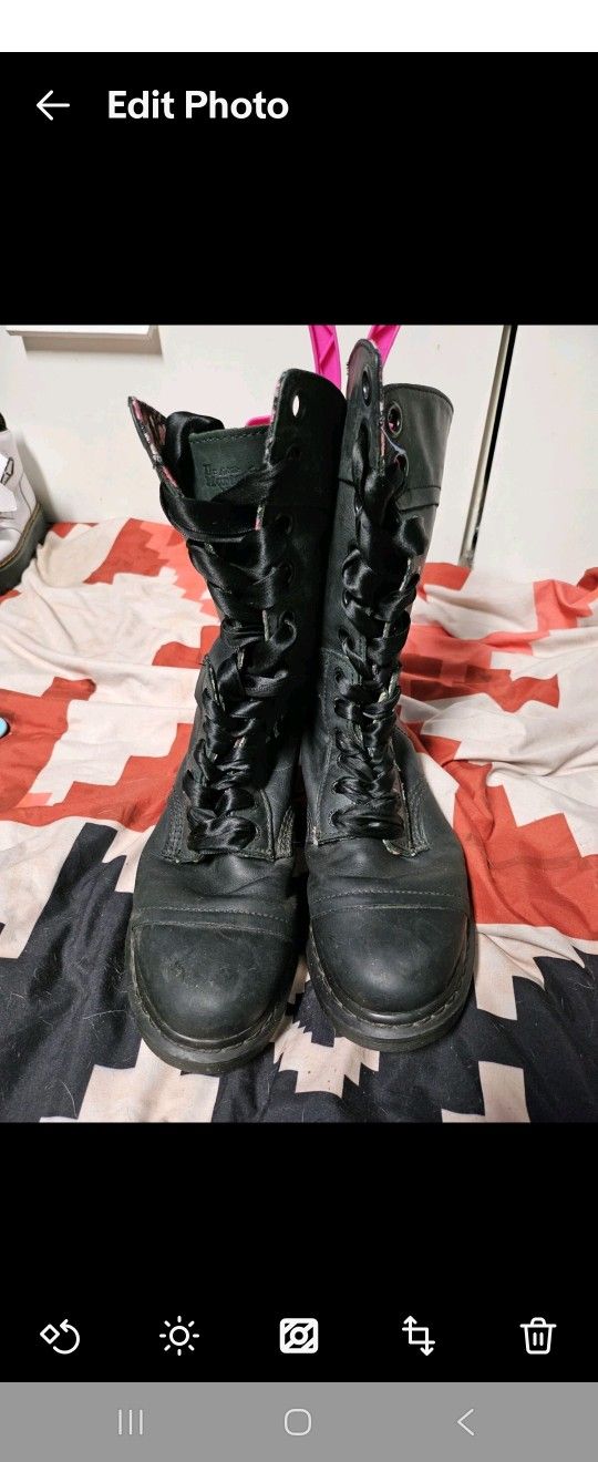 Dr. Martens Triumph 1914 Womens's US size 10 Black Leather Fold Over Floral Combat Boots. The lining is covered in colorful flowers on black to make the color pop. Can fold over to turn into booties. I recently oiled them so they'll be weatherproof for the coming winter.