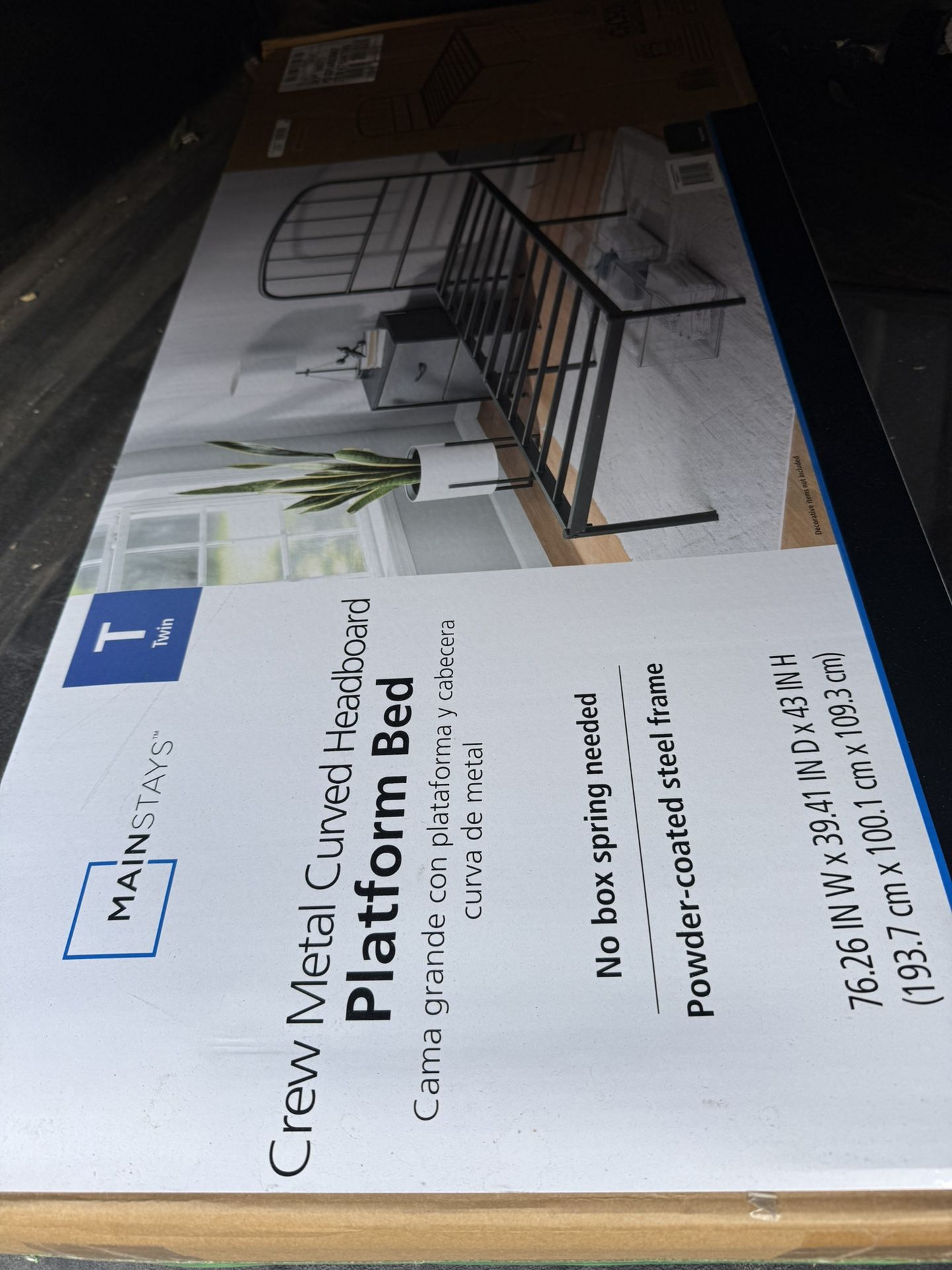 Crew Metal Curved Headboard Platform Bed No box spring needed 76.26 IN W x 39.41 IN D X 43 IN H (193.7 ст x 100.1 ст x 109.3 ст) Used but works properly, has all screws and parts