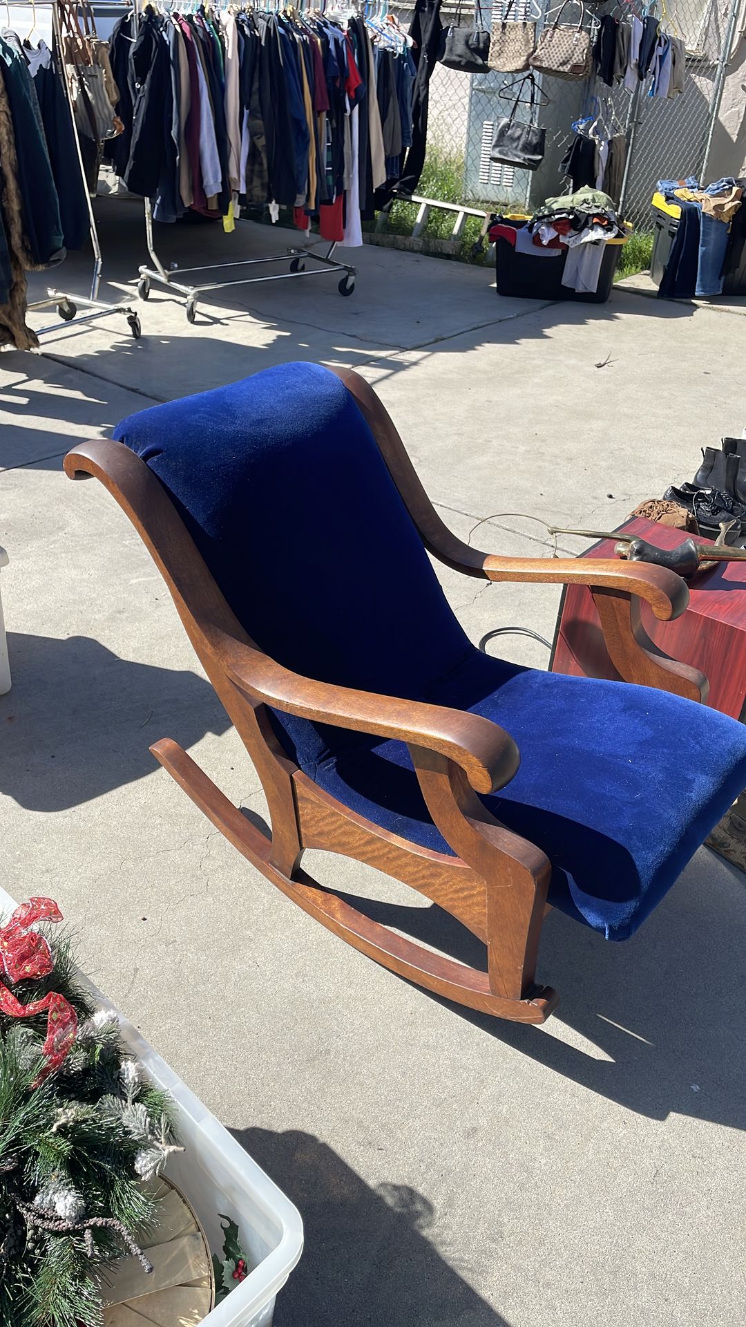 Beautiful antique blue velvet rocking chair. In amazing condition! Wood has an amazing finish.