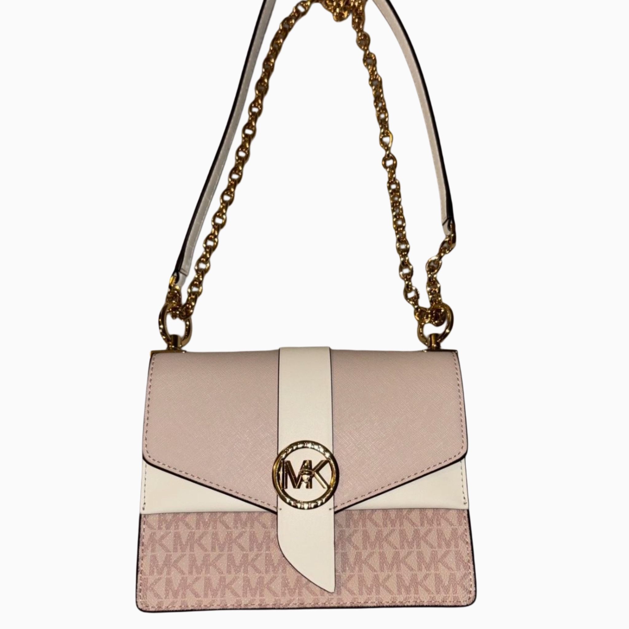 Michael Kors Leather Crossbody Bag can also be used as a hand bag. In excellent condition with no flaws. Measurements: Width- 8in. Height- 6.5in. Depth- 2.7in. Material: leather. Color: Pink & beige. Original price- $300.