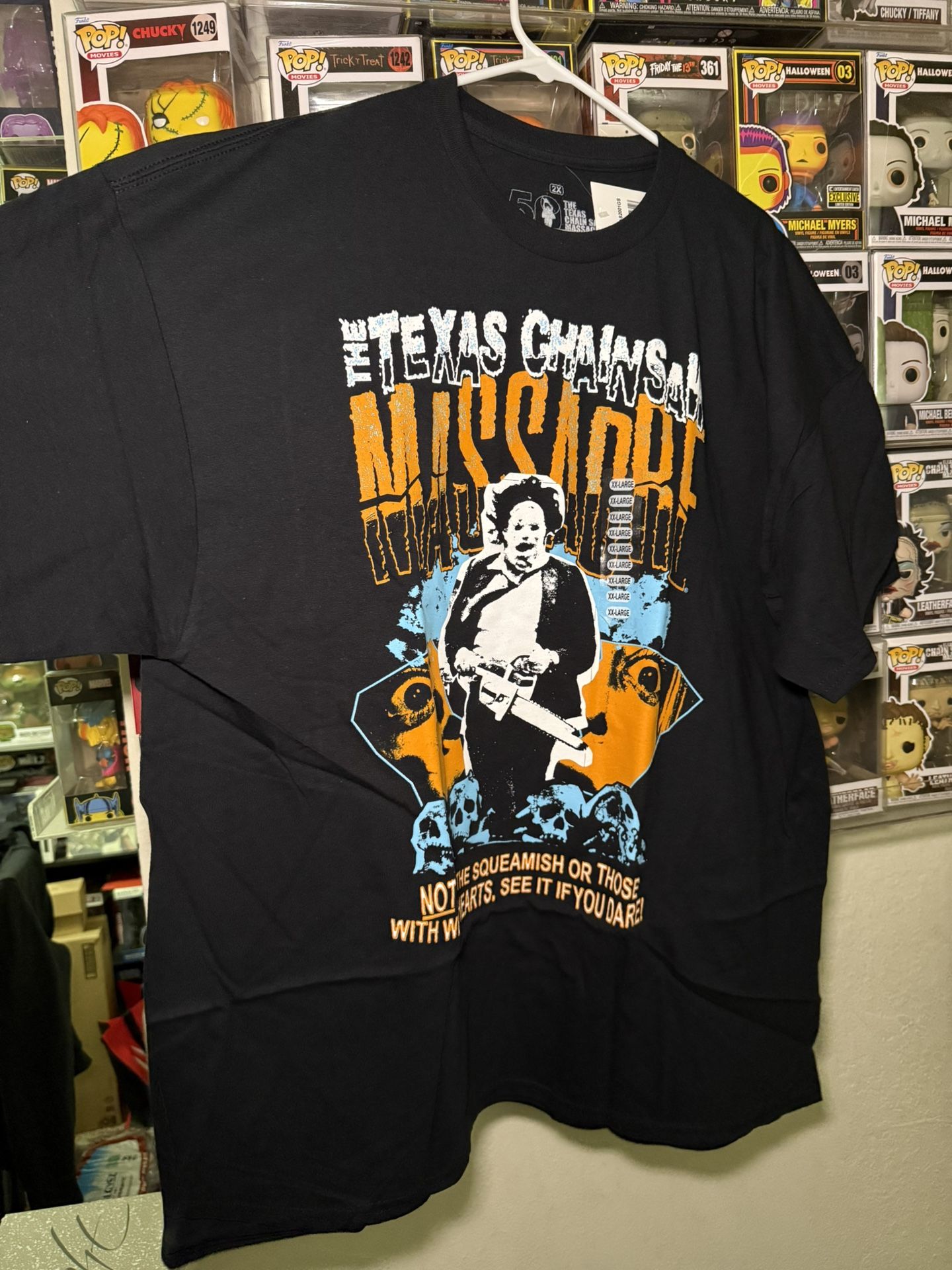 All authentic and officially trademarked! 🩸 All brand new with tags 🏷️ Black/OrangeBlue TCM shirt 2XL- $30 (I have 2) Black/White TCM shirt - XL (stain shown) $20 Party City exclusive TCM shirt - XL $40 Message with questions or concerns!