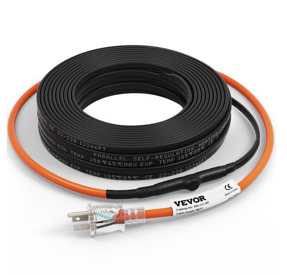 VEVOR 80-ft 5W/ft Self-Regulating Electric Heat Cable for Plumbing Freeze Prevention on Pipes in Cold Weather =X3-710