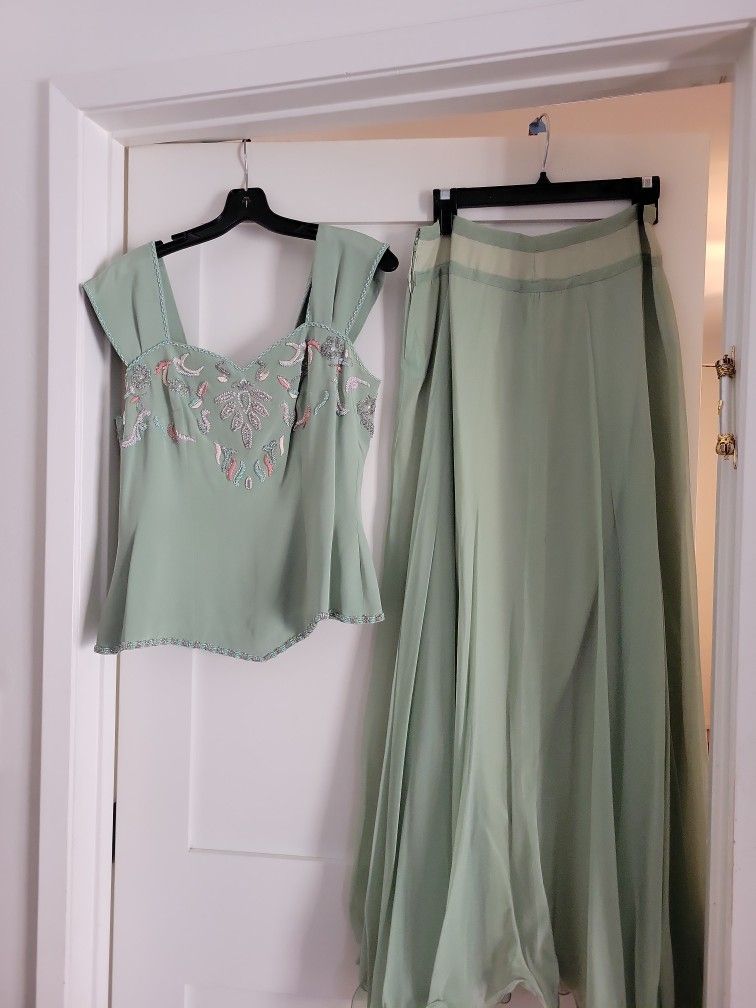 Elagent, vintage two piece set with beautiful, custom beading of the top. Top is very comfortable, but is a fashionable corset-style top. Breathable fabric and excellent quality. Like new, only worn once. Size 12.