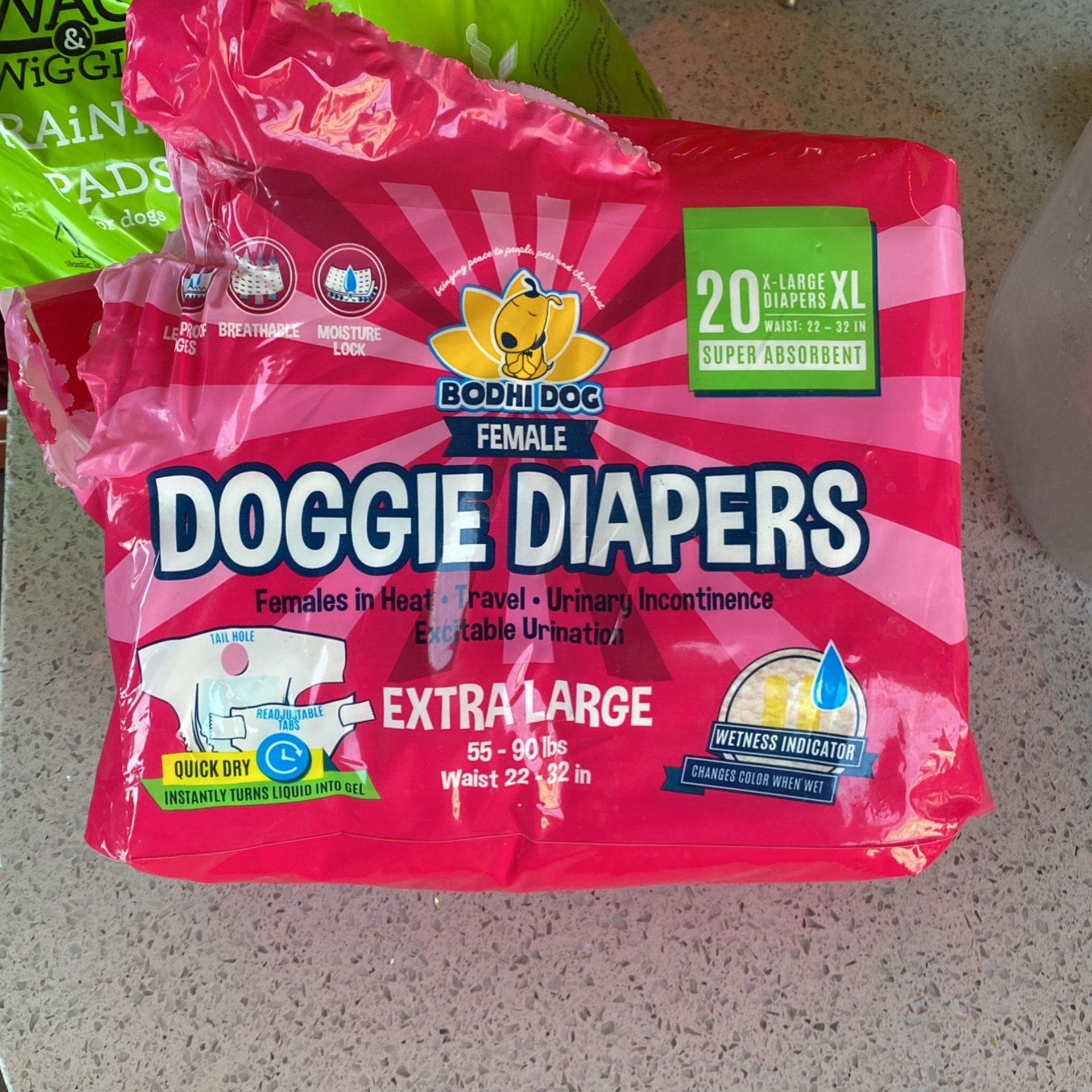 Dog is fully trained, we have no use, over 30pads and full bag of diapers minus 1