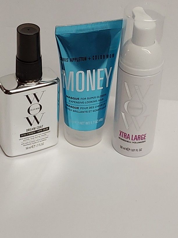 COLOR WOW BEST SELLER HAIR TRAVEL BUNDLE- BRAND NEW The best for frizz free hair!!! 1. Xtra Large Bombshell Volumizer – Luxe, expansive volume without alcohol, salt or drying resins 2. Proprietary Anti-Humidity Complex (Dream Coat Supernatural Treatment Spray for Frizzy Hair): Humidity-proofs, prevents frizz, adds shine, and heat protects. 3.Chris Appleton Money Masque (1.7 fl oz/ 50 ml) - Celebrity Stylist Chris Appleton’s 1-step-prep for luxe, super healthy hair - Weightless formula instantly absorbs; leaves no waxy, heavy buildup - Penetrates deep to help strengthen, repair and renew suppleness - Deep conditioning hair mask for all hair types - Heat protection Why It’s Wow Weightless formulas instantly absorb; leave no waxy, heavy buildup Penetrate deep to help strengthen, repair and renew suppleness Strengthen strands to support healthy growth Moisturize + de-frizz for smooth, silky, luxe texture Like a whole new head of luxe, healthy-looking hair