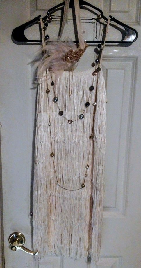 . Comes with necklace ,headpiece, and gloves. Sleeveless mini dress featuring spaghetti straps and multiple tiers of fringe that create movement. I have red, white, and black gloves/ headpiece that can be traded with the champagne color.