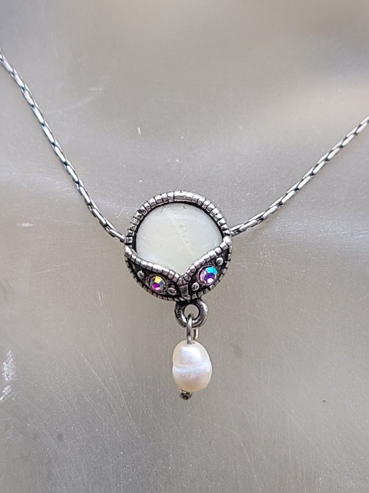 Magnificent MOON OVER MIAMI art deco designer necklace. Truly one of a kind it has shell inlay ACCENTED with aurora borealis crystals. It has a genuine freshwater pearl to match the shell. There is an embargo on abalone; therefore this cannot be duplicated. One of a kind. This can be worn for any occasion dress or casual. Fabulous look on. It is 18" long and is accompanied with a Lobster Claw clasp which includes a 2" extension. Exquisite gift for any holidays. From a smoke-free pet-free home. Please click on my profile to see all my other treasures. Thank you for looking and have a great day.