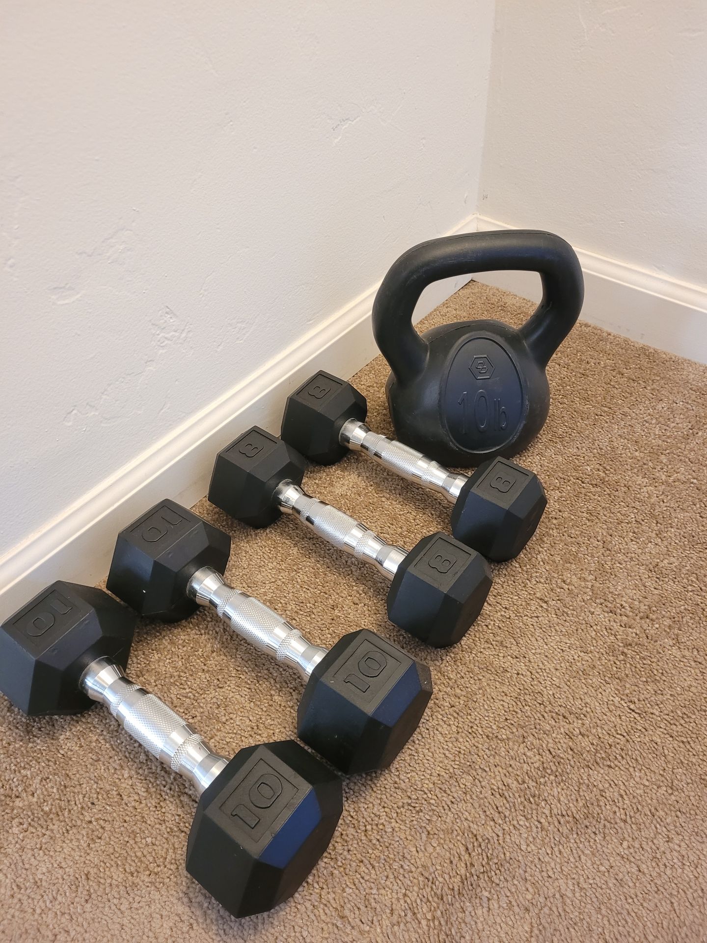 Selling all together as a set. Includes (2) 8lb dumbells, (2) 10lb dumbells, and (1) 10lb kettleball. Pick up in La Mesa. $50 cash only please.
