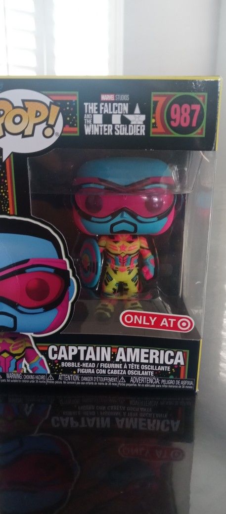 Brand new Captain America the falcon and the Winter soldier glow in the dark pop it does have a small crease on the side of the box as shown in the picture this was a Target exclusive please only contact when ready to pick up