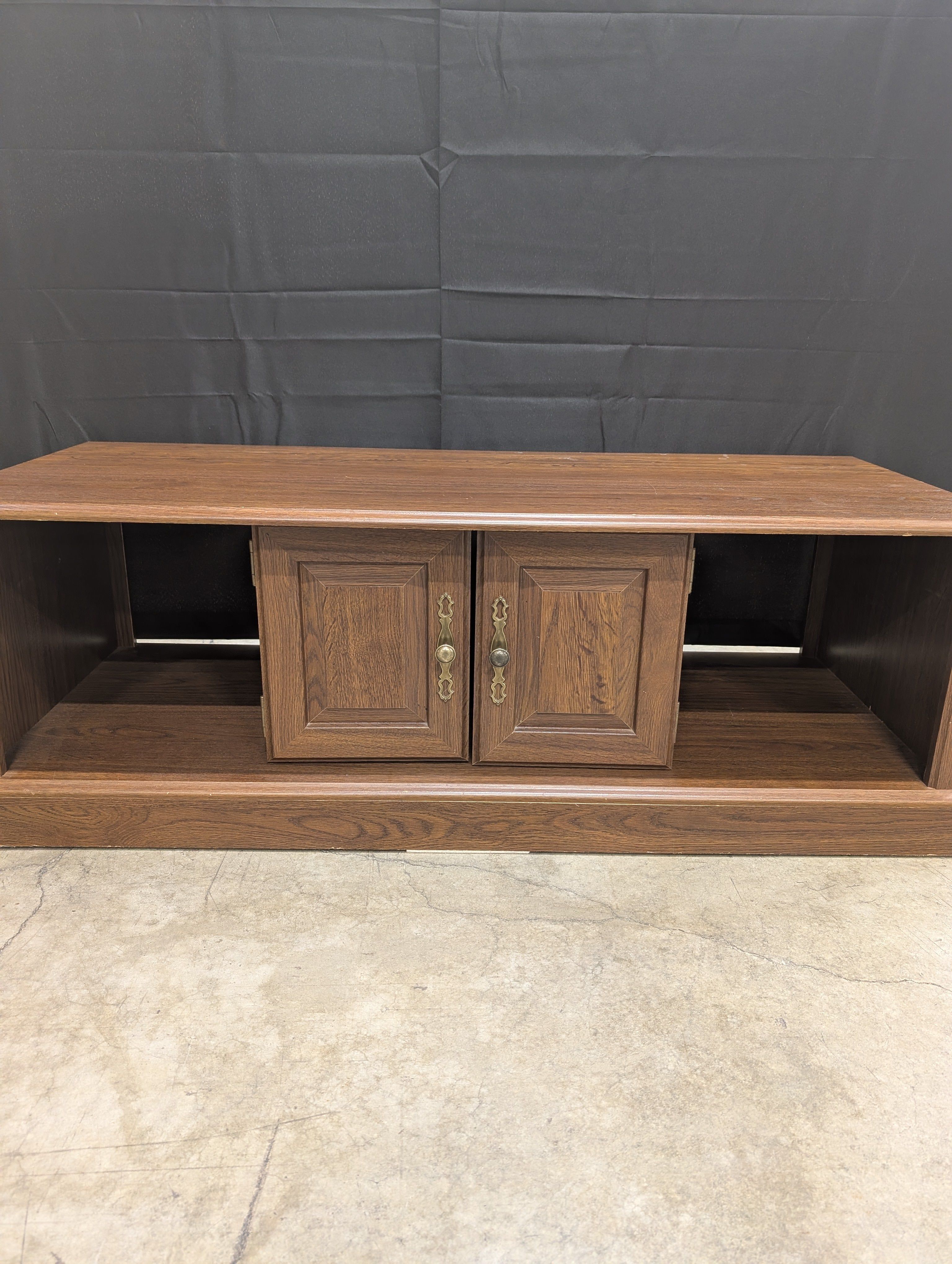This rectangular coffee table features a rich dark brown wood finish. It includes an open lower shelf for display or storage. Two central cabinet doors with decorative panels and metal pulls offer concealed storage.